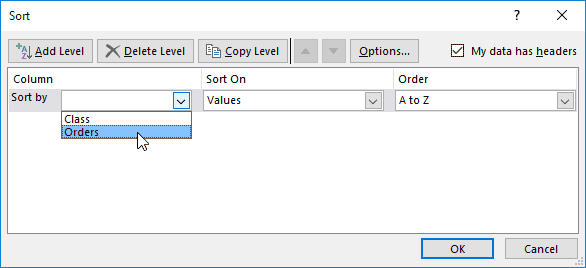 3. Bảng tùy chọn Sort sẽ xuất hiện, bạn chọn cột mà mình muốn phân loại. Trong ví dụ, chúng tôi chọn cột Orders.