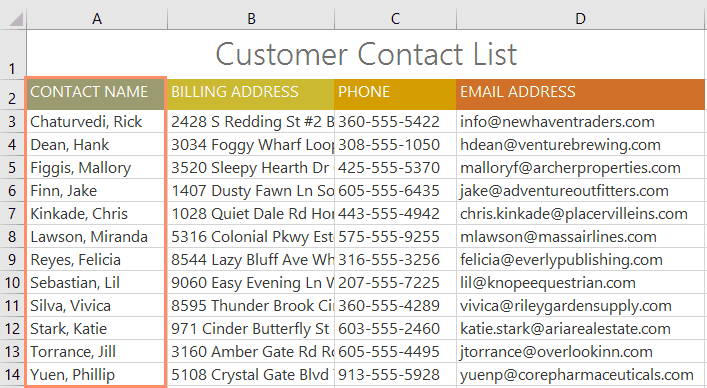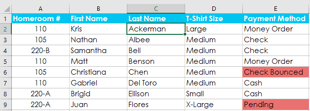 Dưới đây là một ví dụ về việc sắp xếp theo họ của khách hàng đặt áo phông theo bảng chữ cái (Cột C)